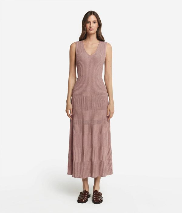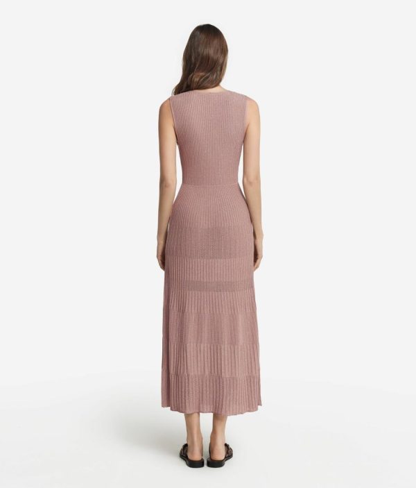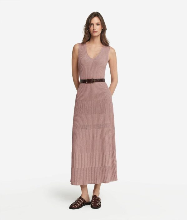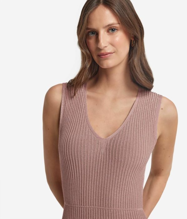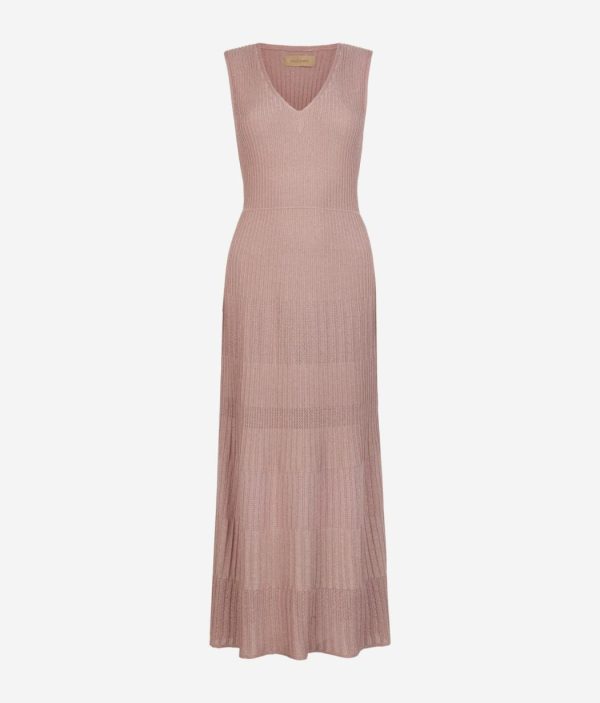 Romantico e senza tempo, questo abito smanicato in viscosa incanta per l’ampio scollo a V e la delicata lavorazione a costine con lamè. La vestibilità è più aderente sul busto, con una graduale svasatura dalla vita fino al fondo, che dona un movimento fluido e armonioso alla silhouette. La lunghezza alla caviglia rende il capo sofisticato, per distinguersi con classe durante momenti speciali, senza mai passare inosservata.