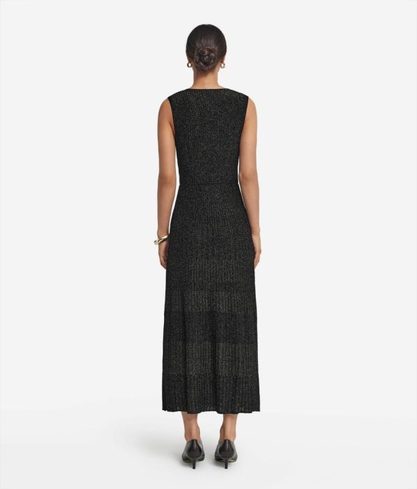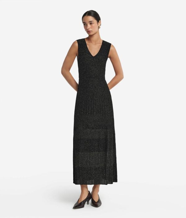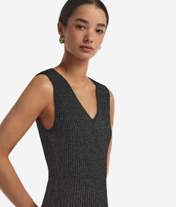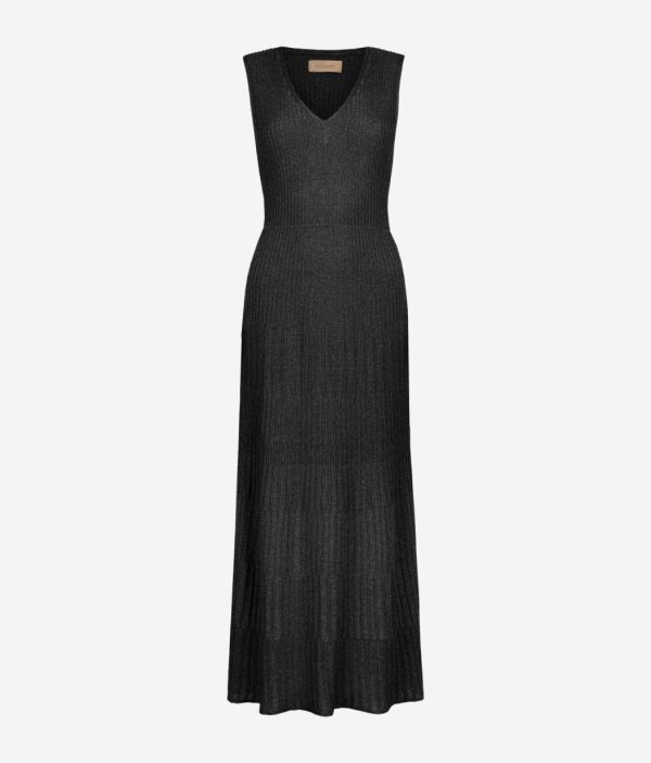 Romantico e senza tempo, questo abito smanicato in viscosa incanta per l’ampio scollo a V e la delicata lavorazione a costine con lamè. La vestibilità è più aderente sul busto, con una graduale svasatura dalla vita fino al fondo, che dona un movimento fluido e armonioso alla silhouette. La lunghezza alla caviglia rende il capo sofisticato, per distinguersi con classe durante momenti speciali, senza mai passare inosservata.