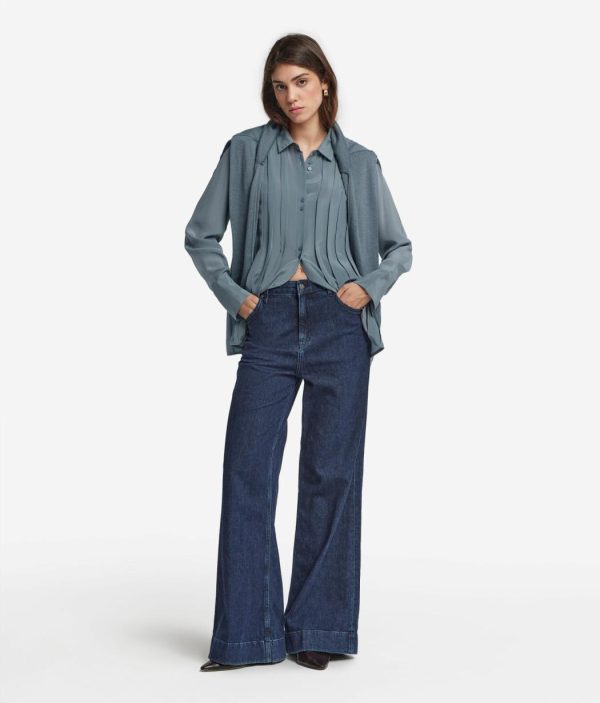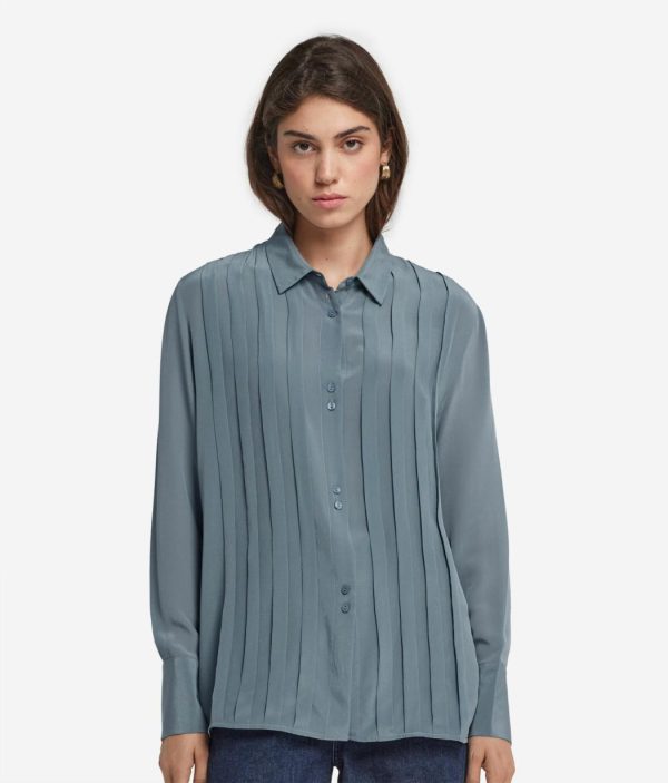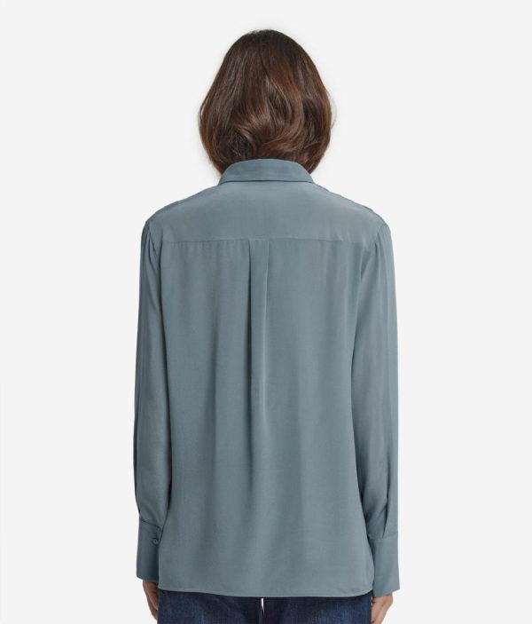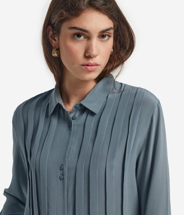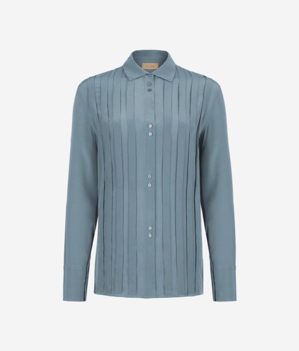 Avvolta in una texture leggera di crêpe de chine di seta, questa camicia incanta con i suoi dettagli delicati e raffinati. Il colletto classico introduce un gioco di pieghe leggere sul davanti, che dona movimento e grazia al capo. La chiusura formata da coppie di bottoni aggiunge un dettaglio distintivo, mentre i polsi alti donano struttura al design. Il fondo dritto, le spalle regolari e la vestibilità rilassata la rendono una scelta sofisticata e versatile per ogni occasione.