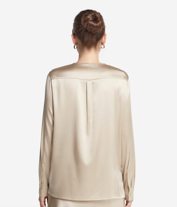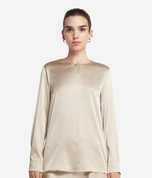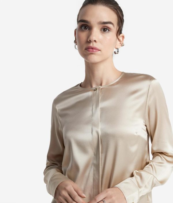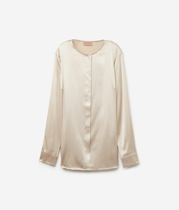 Realizzata in raso di seta, questa camicia combina l’eleganza del tessuto satinato con dettagli sartoriali unici ed esclusivi. I bottoni gioiello arricchiscono lo scollo e i polsini, aggiungendo un tocco di luce e raffinatezza. La chiusura a scomparsa garantisce un aspetto uniforme e impeccabile mentre le spalle regolari assicurano una vestibilità confortevole e naturale. É la scelta perfetta per chi ama distinguersi con classe e stile senza scendere a compromessi.