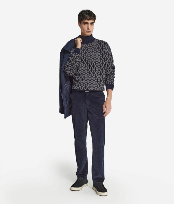 Caratterizzato da un motivo jacquard optical bicolore, questo dolcevita in pregiato Cashmere Ultrasoft cattura l’attenzione con il suo design moderno e sofisticato. Il collo, insieme ai fondi manica e corpo, è realizzato in costa di colore unico, offrendo un contrasto raffinato. Il disegno, realizzato direttamente sulla trama del tessuto, esalta la qualità e la manifattura del capo.