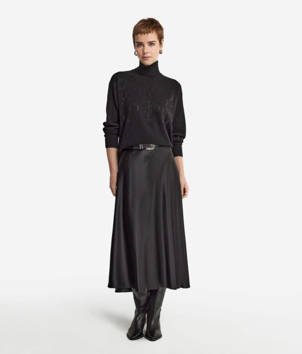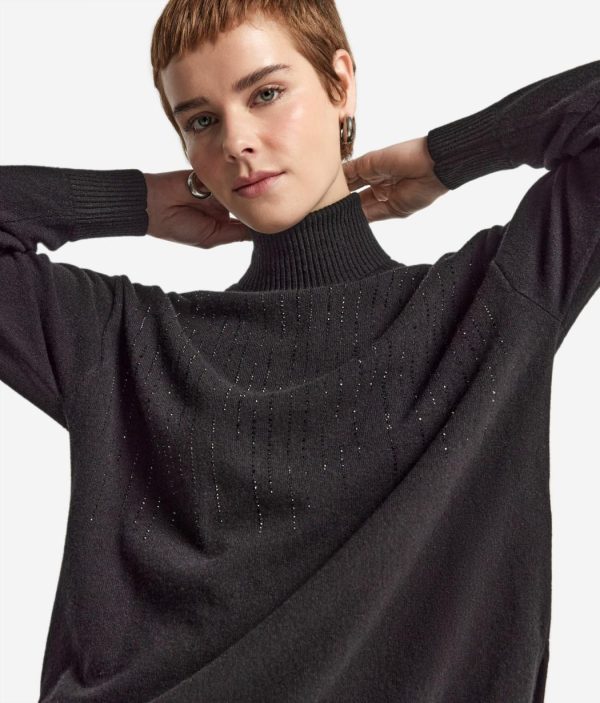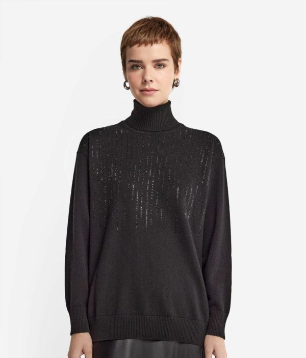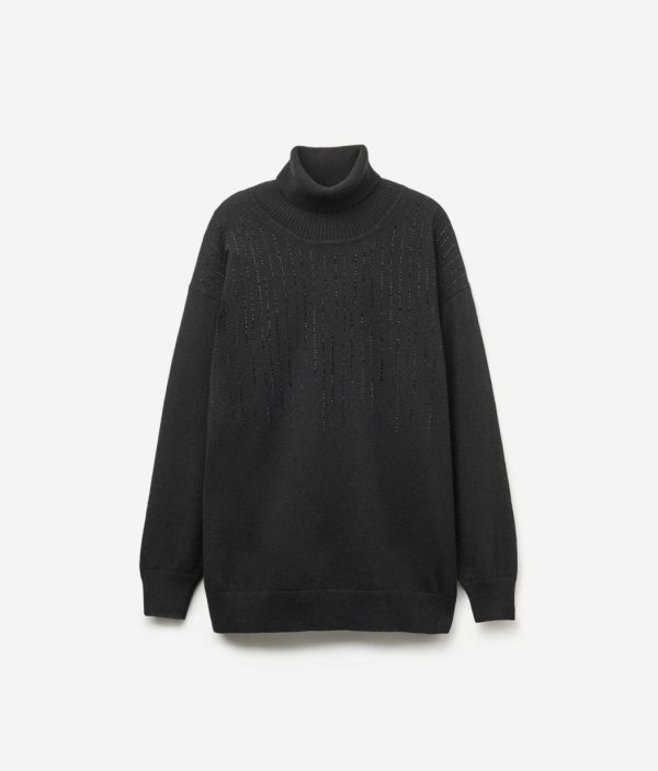 Soffice e avvolgente questo dolcevita realizzato in Cashmere Ultrasoft è il perfetto mix tra eleganza e modernità. La spalla leggermente scesa conferisce una silhouette rilassata e contemporanea, mentre l’applicazione di strass sulla parte frontale, con il suo affascinante effetto degradè, aggiunge un tocco di brillantezza che non passa inosservato. Il collo, il bordo e i polsi, lavorati a costina, offrono un dettaglio raffinato, mentre gli spacchi al fondo contribuiscono a donare una vestibilità morbida.