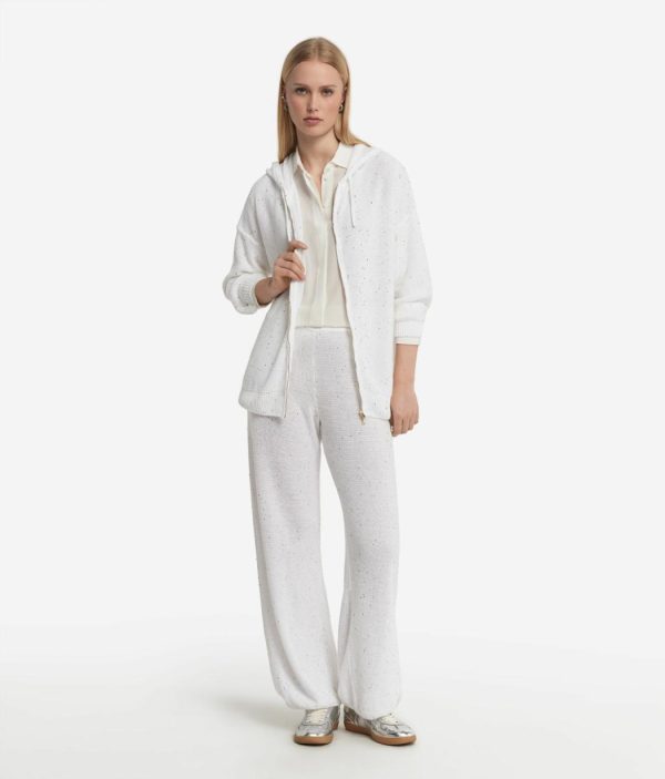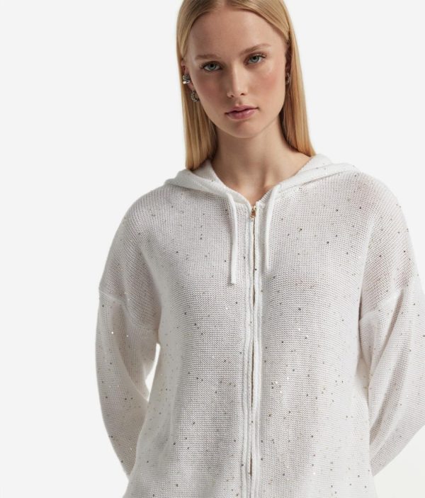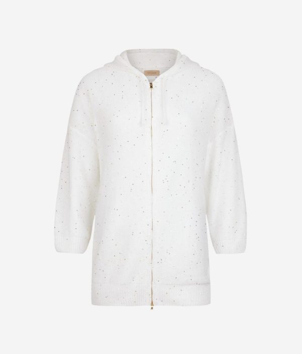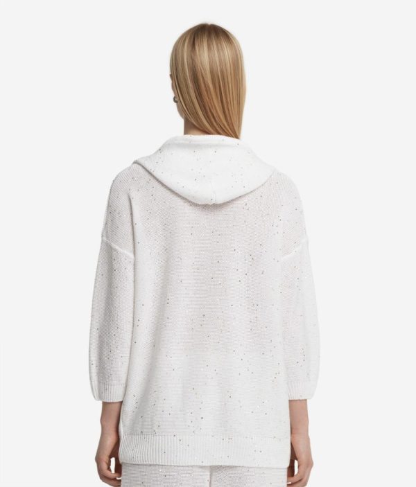 Pregiati materiali incontrano lo stile informale in questa felpa con cappuccio in cotone e lino. Ad arricchire il capo, un delicato filato di micro paillettes che dona luce e raffinatezza. Il cappuccio con coulisse e la chiusura con zip metallica ne conferiscono un accento sportivo, mentre le spalle scese e le maniche a tre quarti donano un design moderno e rilassato.