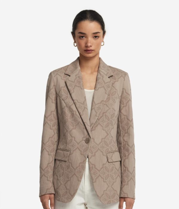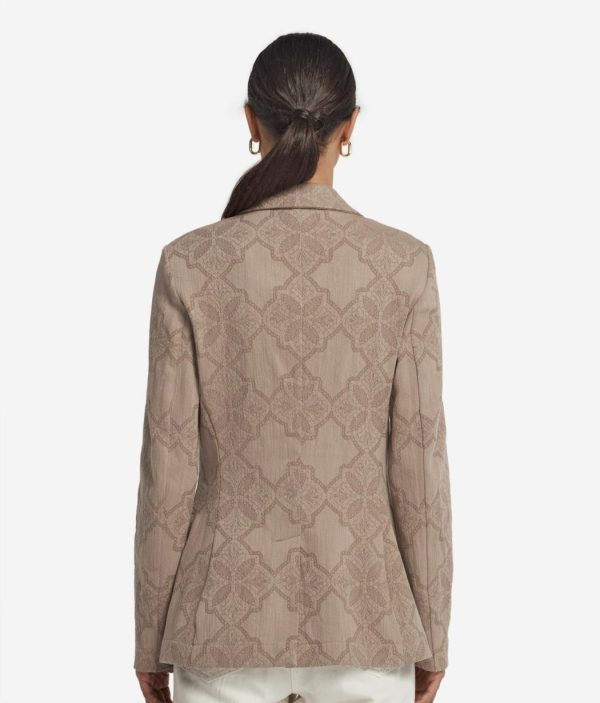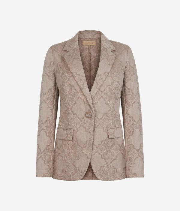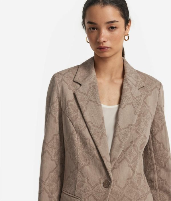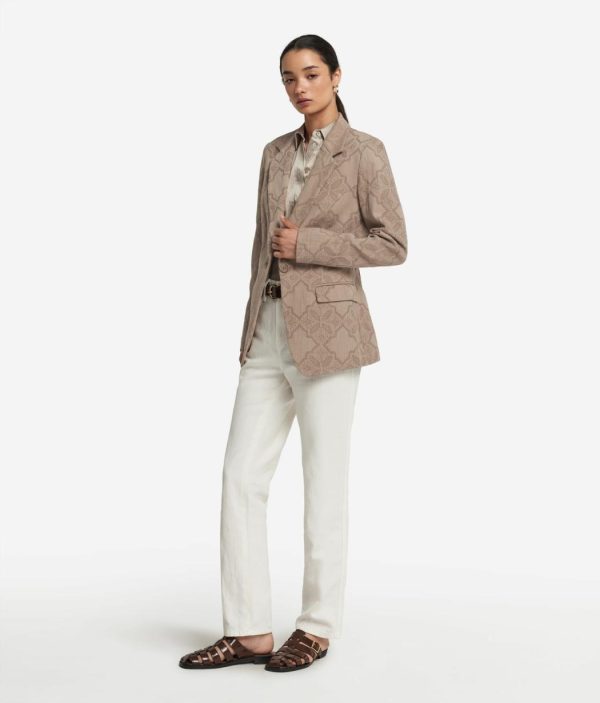 La fantasia jacquard tono su tono dona profondità e carattere a questa giacca realizzata in cotone elasticizzato. Il rever classico aggiunge un tocco di classe mentre spalline imbottite valorizzano la struttura del capo, garantendo una silhouette armoniosa.