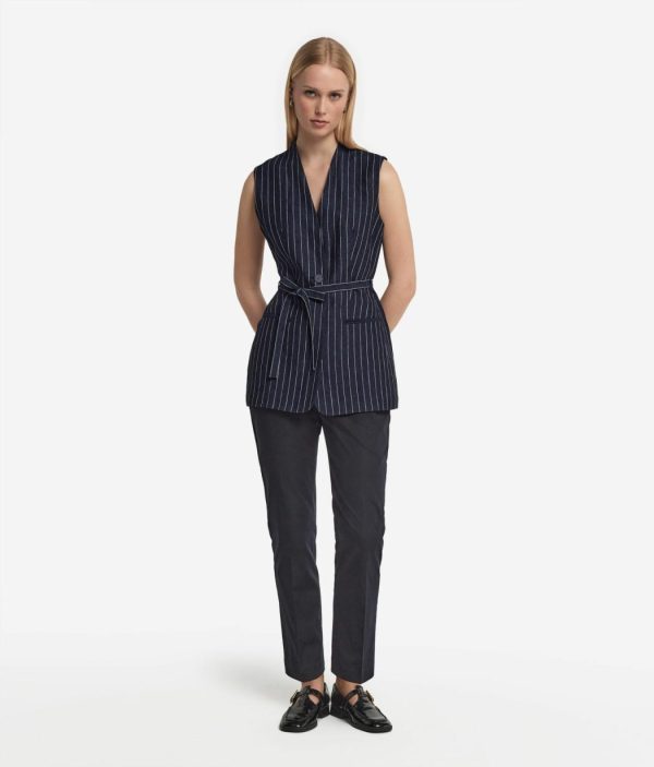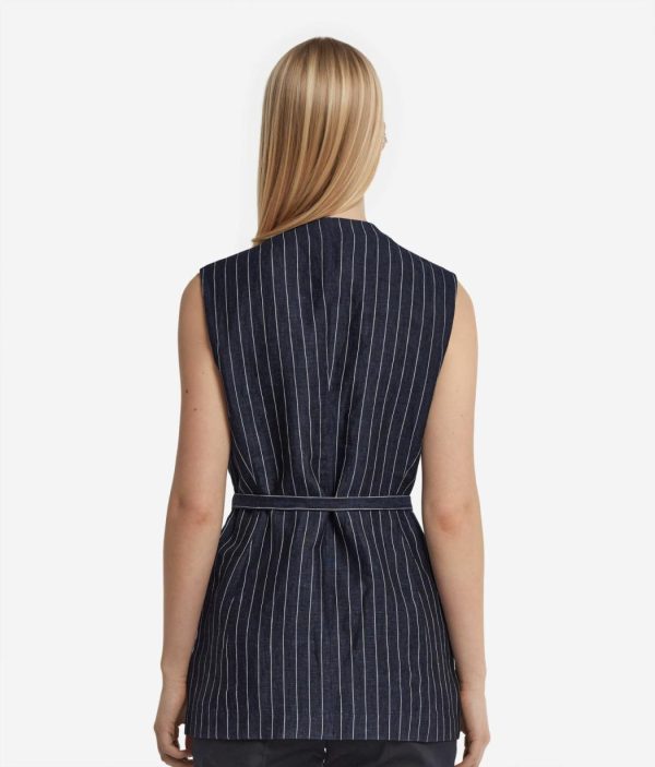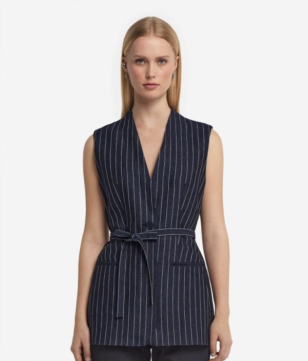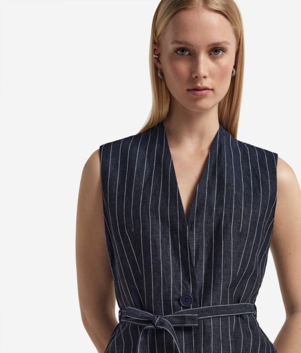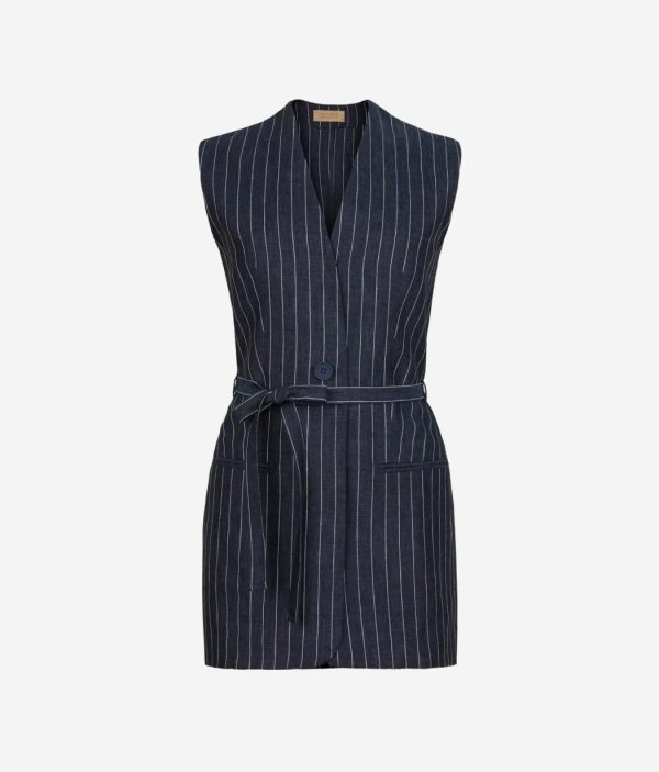Perfetto per completare look sofisticati con un tocco contemporaneo, questo gilet in lino gessato si distingue per il design essenziale con scollo a V e silhouette smanicata. La chiusura frontale a un bottone dona un’eleganza minimalista, mentre la cintura rimovibile permette di personalizzare la vestibilità aggiungendo un accento di raffinatezza al capo.