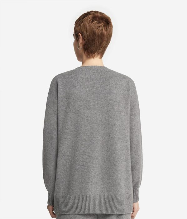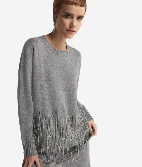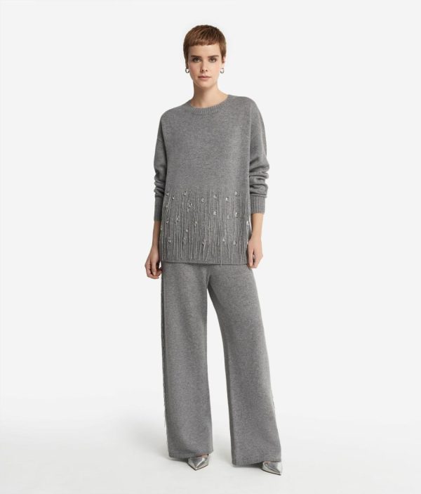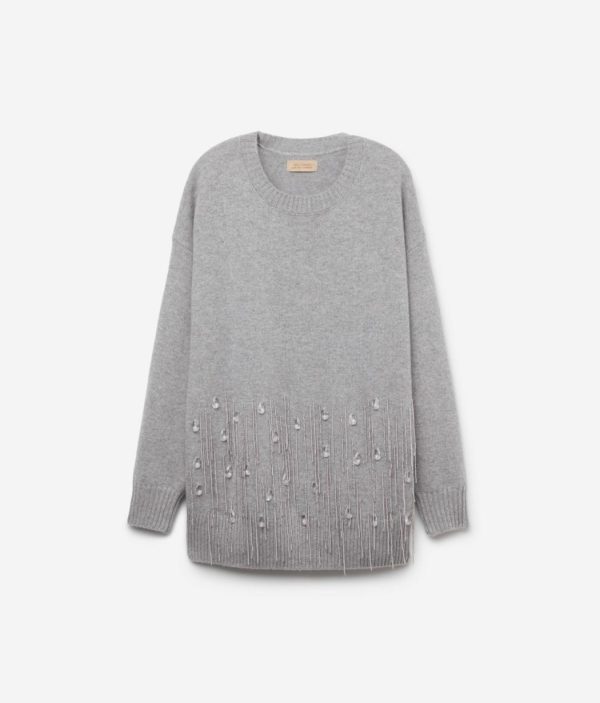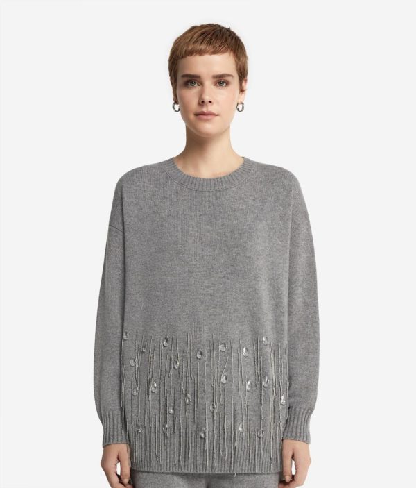 Linee essenziali incontrano elementi contemporanei in questa maglia in pregiato Cashmere Ultrasoft. Il design è reso unico da frange luminose e gocce in vetro applicate al fondo della maglia, donando un tocco di brillantezza e movimento al capo. La spalla scesa e la vestibilità morbida conferiscono un look rilassato e moderno, perfetto per un’eleganza casual e senza tempo.