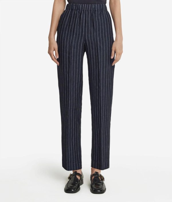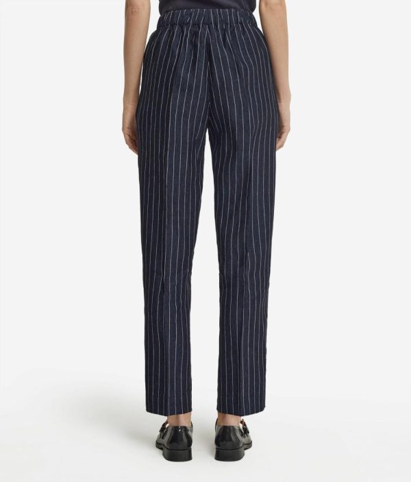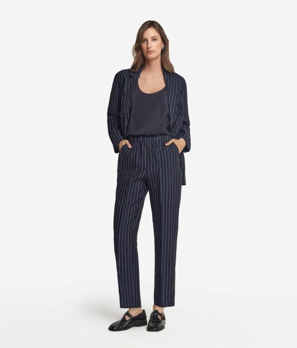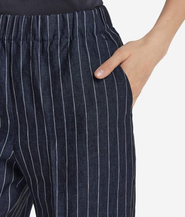 Stile sartoriale e fascino casual caratterizzano questo pantalone in lino gessato, un capo incredibilmente leggero e fresco al tatto. Dalla silhouette morbida e fluida, è arricchito da un elastico in vita e tasche all’americana, che conferiscono un effetto a palloncino elegante e disinvolto. La lunghezza alla caviglia completa il design, rendendo questo modello versatile e adatto ad ogni occasione.